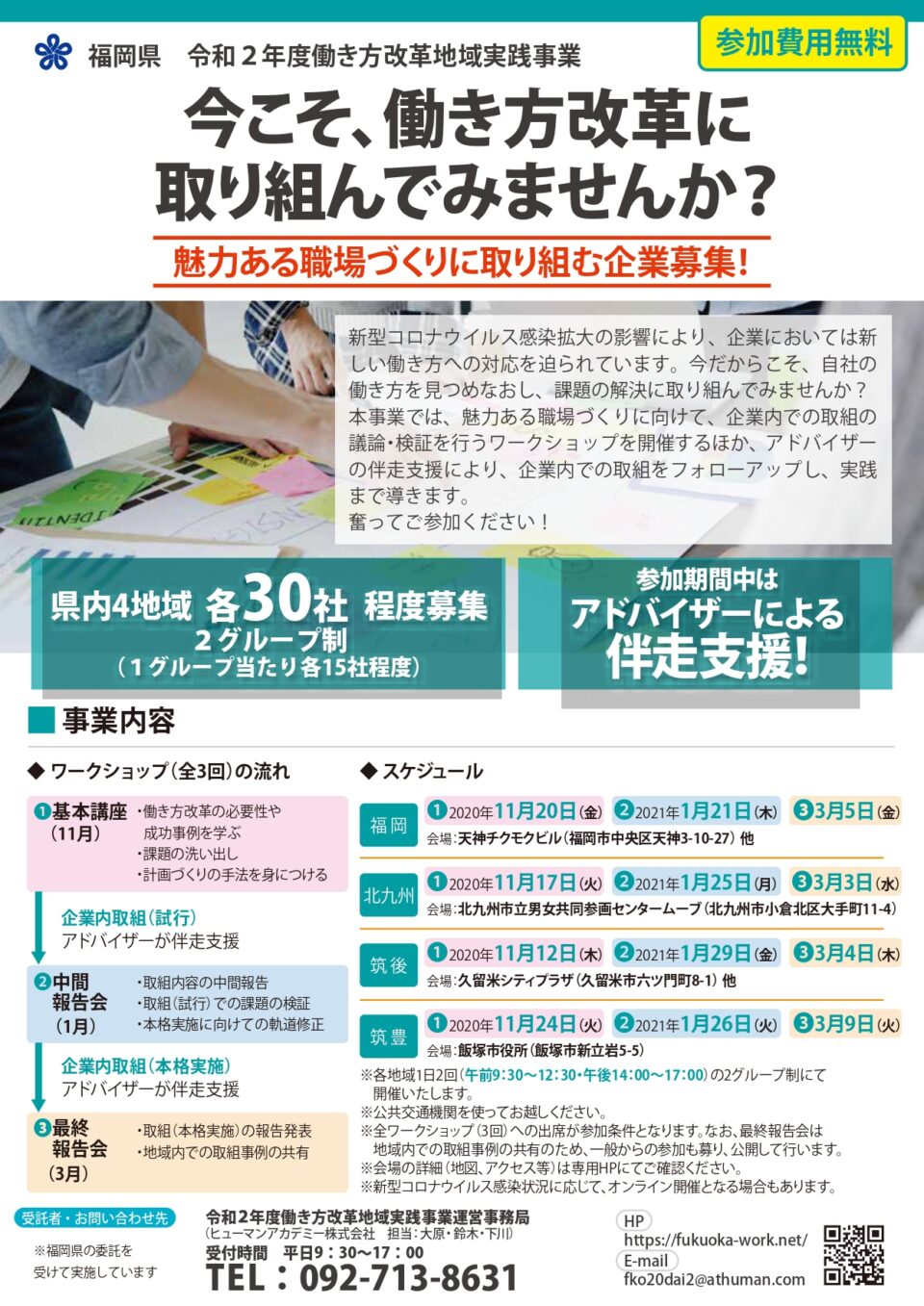 支援情報 働き方改革に取り組んでみませんか? 更新担当者 糸島市商工会 - 2020年10月2日 印刷 新型コロナウイルス感染拡大の影響を受けている今だからこそ、自社の働き方を見つめなおし、課題の解決に取り組んでみませんか?福岡県では、働き方改革に取り組みたい企業を対象に、魅力ある職場づくりに向けてワークショップを開催するほか、アドバイザーの伴走支援を行います。 詳細は下記チラシをご覧の上、お申込ください。 共有: X で共有 (新しいウィンドウで開きます) X Facebook で共有 (新しいウィンドウで開きます) Facebook いいね:いいね 読み込み中… 関連