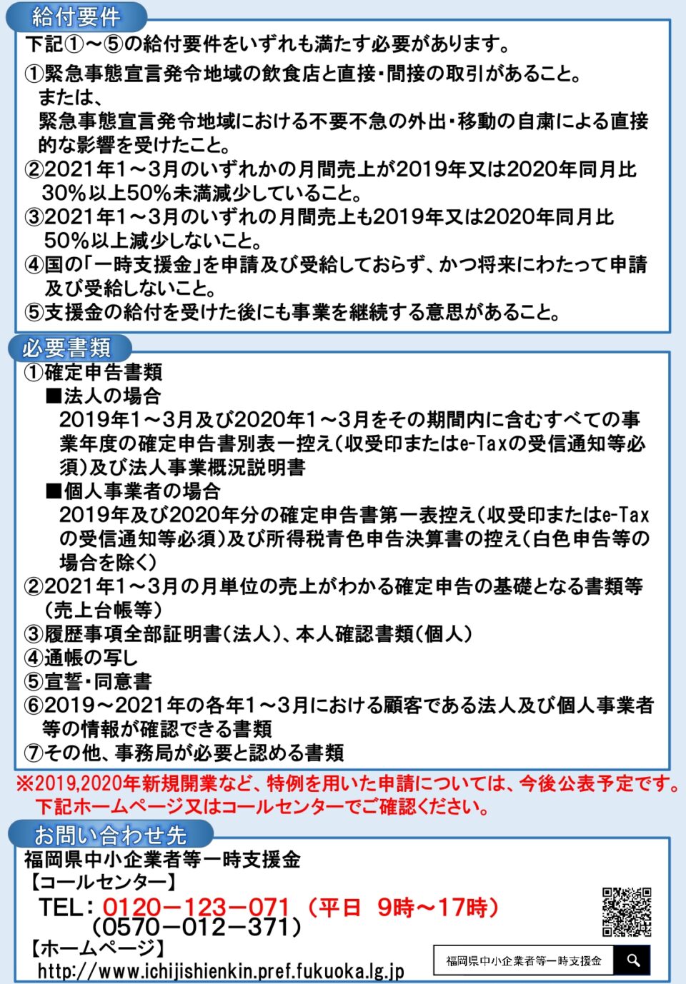 支援情報 福岡県中小企業者等一時支援金 更新担当者 糸島市商工会 - 2021年3月15日 印刷 福岡県では、新型コロナウイルス感染症緊急事態宣言に伴う、飲食店の営業時間短縮や不要不急の外出・移動の自粛により、特に大きな影響を受け、売上が大きく減少している中小企業者等に対して、事業の継続を支援する一時支援金を給付します。 詳細は福岡県ホームページをご覧ください ⇒ 福岡県ホームページ 共有: クリックして X で共有 (新しいウィンドウで開きます) X Facebook で共有するにはクリックしてください (新しいウィンドウで開きます) Facebook いいね:いいね 読み込み中… 関連