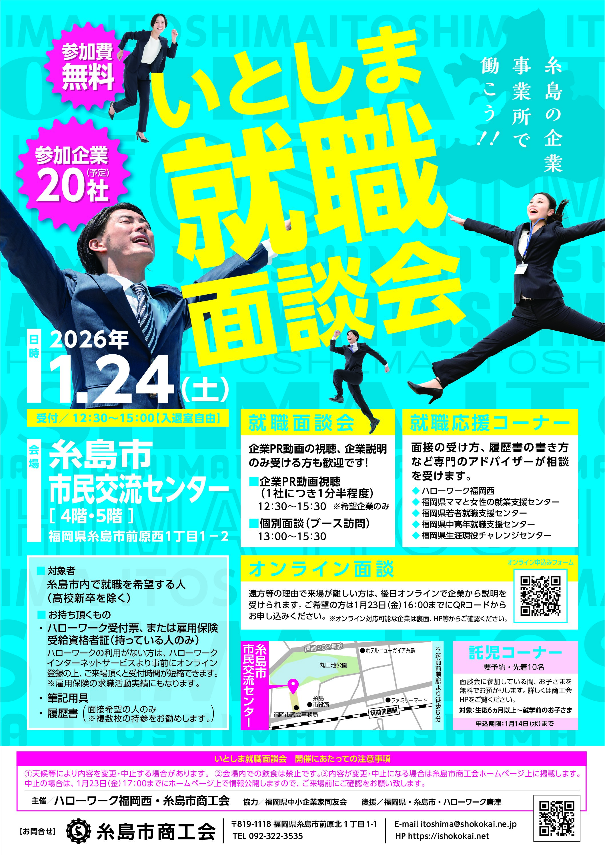 糸島市内の正社員、パート・アルバイトを募集している企業20社(予定)が令和8年1月24日(土曜日)、糸島市市民交流センターに集まります。 企業ブースを自由に訪問して、採用担当者から、企業概要、業務内容や求人の内容などを直接聞くことができます。 希望者はその場で面接も受けることができます。企業PR動画の視聴、企業説明のみを受ける方も歓迎です。一度に多くの企業と出会える場となりますので、 糸島市で仕事を探している方は、ぜひ会場へお越しください。